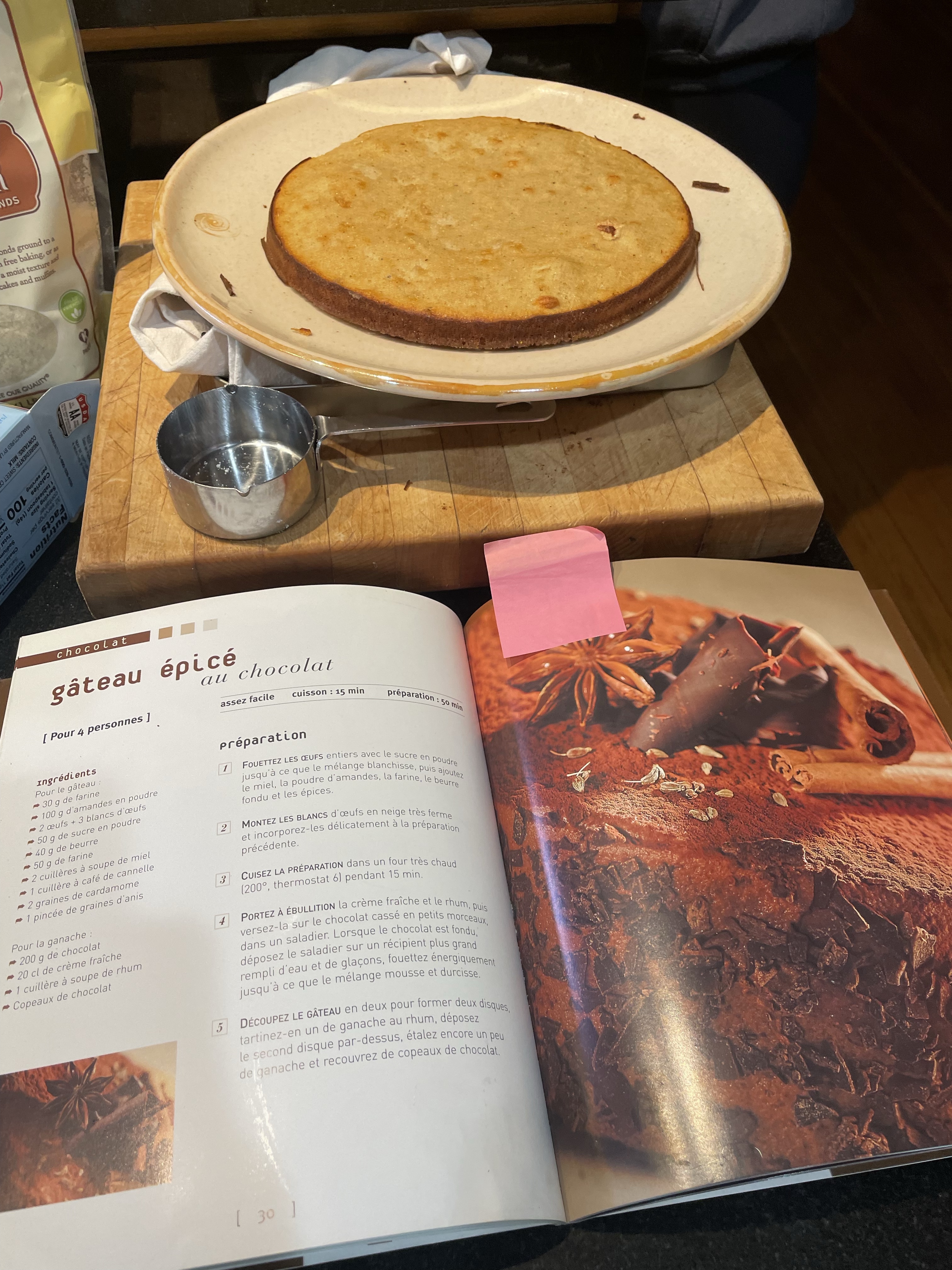 There are some differences in how the recipes in this book are written. First, all measurements are metric. My kitchen scale and Google came in handy. Second, there was no indication of what size cake pan to use besides the note that it serves 4 and the scale of items in the photo made it seem small. I baked one recipe and realized I would need to bake another in order to layer the cake at all. I have doubled this recipe. Third, many French cake recipes use whipped egg whites as leavening. There is no baking soda or baking powder in this recipe.