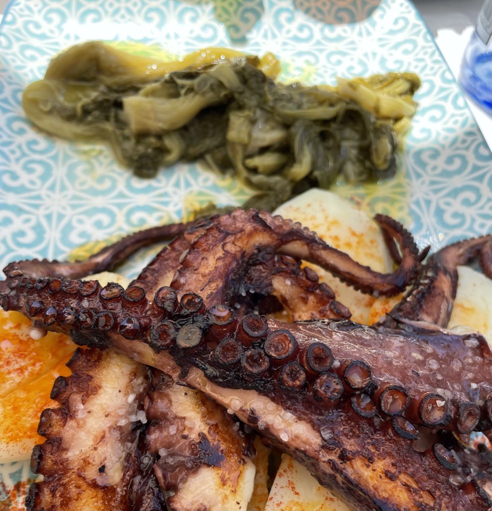 All that ocean meant a lot of seafood! We ate clams and razor clams and scallops. Squid, octopus, and sardines. Gooseneck barnacles. Hake and cod. All beautifully and simply prepared. It is also famous for two other dishes now associated with the Camino: Tarte de Santiago and Empanadas Gallegos. The Tarte de Santiago is an almond tart dusted with powdered sugar that is in the windows of all the bakeries and tourist shops. Empanadas in Galicia are not hand pies like in Latin America. They are more like a sheet pie and served in squares like Neapolitan pizza.