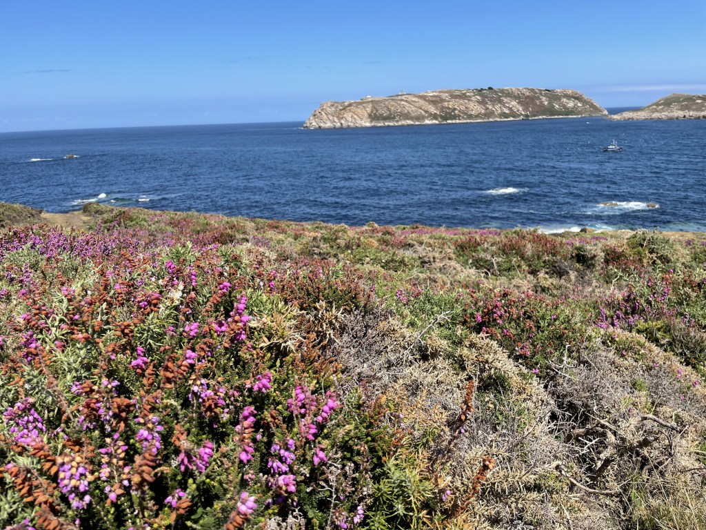 We did a lot of walking in Galicia. The rocky coastline has numerous hiking trails that trace rocky cliffs interspersed with fine sandy coves and beaches. In July, the cliffs were covered with blossoming heather and gorse. The ocean was clear, clean, and cold with contrasts of turquoise blue, dark blue and white foam.