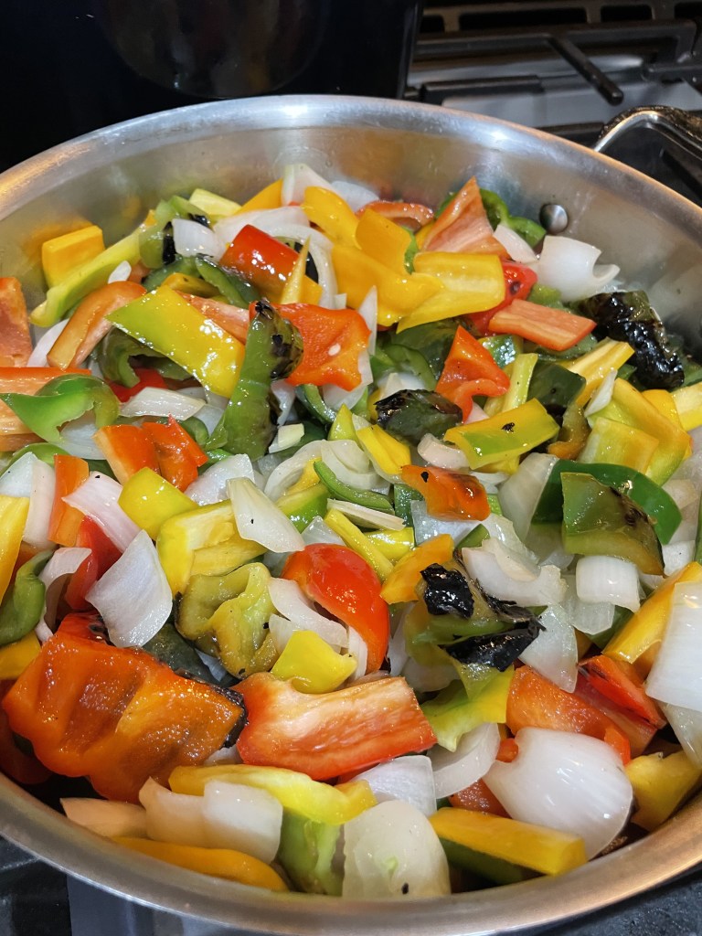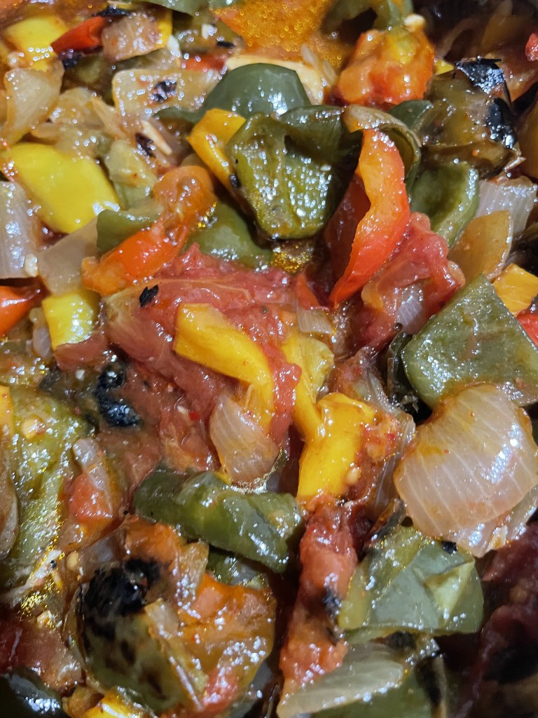 A variety of bell peppers (any color or size) about 3-4. I roasted the bell peppers on my stove top before removing the stems, seeds and veins. This step is completely optional and not apparently traditional. Slice into strips.