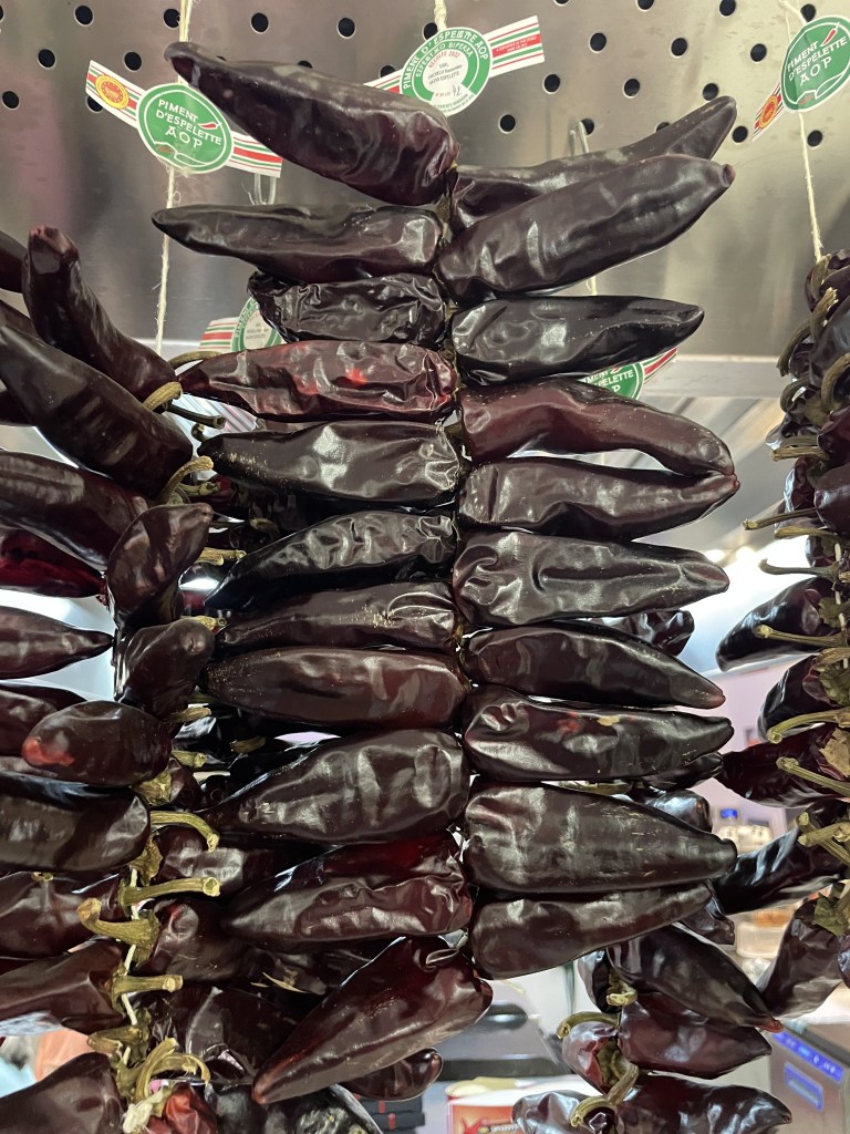 Last summer, I spent some time in the Basque country in France. This obviously necessitated a trip to the town of Espelette and a tour of a piment farm and production facility. It also meant that I had to try out various products seasoned with Piment d’Espelette — cured sausages and hams, chocolates, liqueurs, and a delightful dish called “piperade.” Piperade is a bit like a Basque version of ratatouille — peppers, onions, garlic, tomatoes (thanks again to the indigenous Mexicans!) and Piment d’Espelette. It does not have eggplant and squash. It was mostly served as a side dish along with steamed potatoes (thank you indigenous peoples from the Andes!) and some kind of meat or fish.